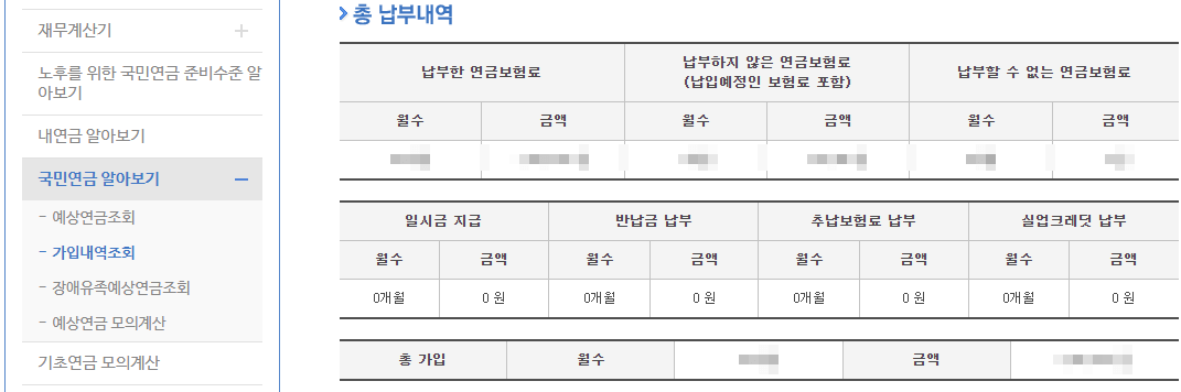 이외에도 왼쪽 메뉴를 보시게 되면 가입 내역 조회가 있으므로 내가 몇개월을 연금보험료를 냈는지, 총 납부 금액은 얼마인지를 찾아보실 수 있게 되어 있습니다.