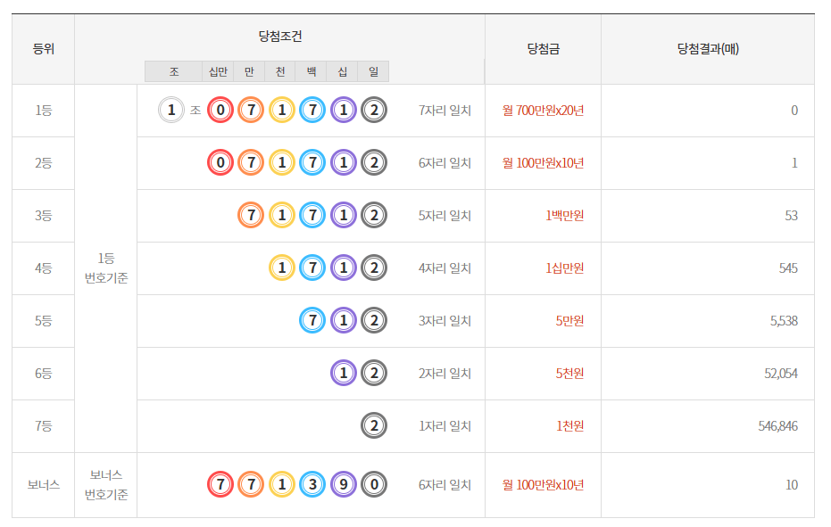 또한 보너스등수인 3등은 각 조별로 추가 추첨을 하여 6자리 번호가 모두 일치할때 2등과 마찬가지로 100만 원씩 10년간 받게 됩니다