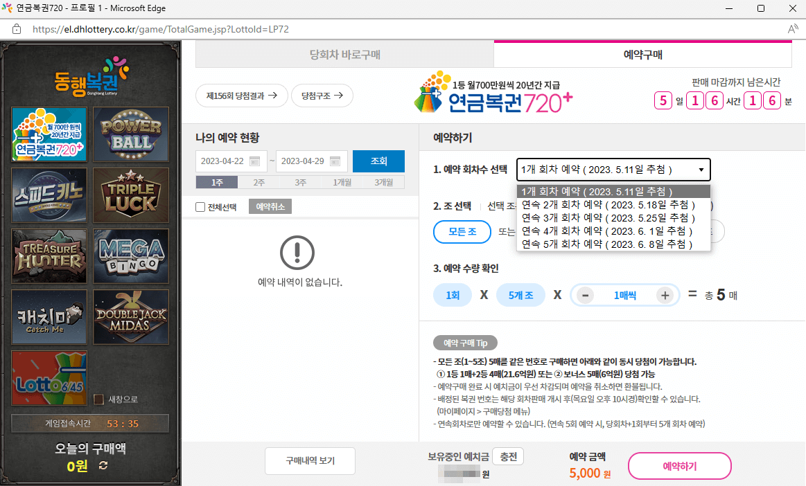 그래서 연금복권 720 에서는 연금복권을 5회차 까지 미리예약 구매 할 수 있습니다. 이로 인해 내 번호로 계속 동일하게 구매하고자 하는 분들은 미리 예약을 잡아 구매해 보시길 추천드립니다.