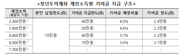 2)개인 소득이 4,800만원 이하인 경우에는 납입한도가 70만원이 되지 않아도 정부가 기여금을 모두 수령할 수 있도록 별도조정한다. (월 70의 납입이 힘들경우 각 기여금 지급 한도에 따라 넣으면 된다)